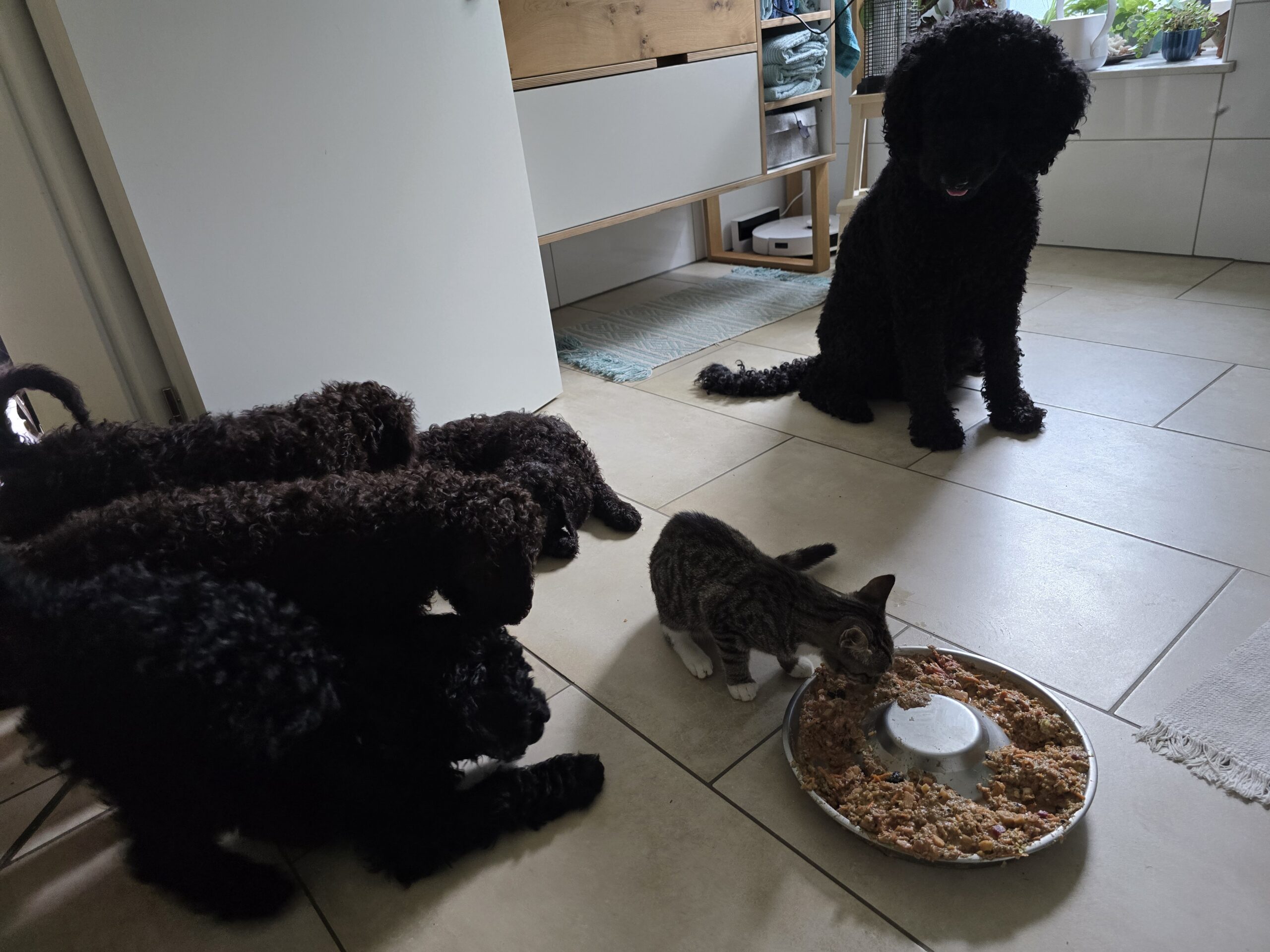 Heute haben wir Mamas Kumpel Gustav kennengelernt. Gustav hat schon oft nach uns geschaut als wir noch kleine Babys waren und in unserer Wurfkiste gequäkt haben. Und jetzt sind wir endlich groß genug, um uns richtig zu beschnuppern. Unsere Menschen-Mama hat gesagt, dass Gustav kein Spielzeug ist und wir Respekt vor ihm haben sollen. Wir sollen lernen, dass Katzen keine Beute sind und nicht gejagt werden. Vielleicht können wir dann später auch so einen coolen Katzen-Kumpel haben wie Mama-Mika.